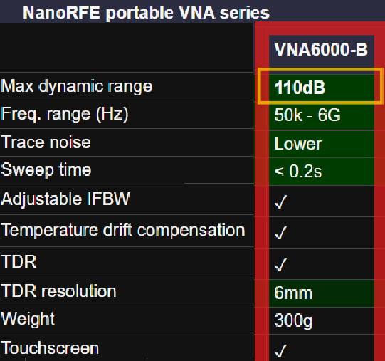 I doubt any of the current crop of inexpensive VNAs has a dynamic range of