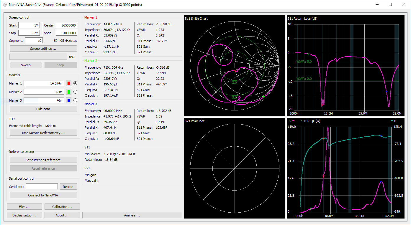 - Live updates of data from the NanoVNA, including for multi-segment sweeps