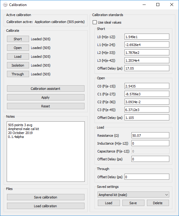 In-application calibration is available, either assuming ideal standards or with relevant standard correction. To manually calibrate, sweep each standard in turn and press the relevant button in the calibration window. For assisted calibration, press the "Calibration Assistant" button. If desired, enter a note in the provided field describing the conditions under which the calibration was performed.